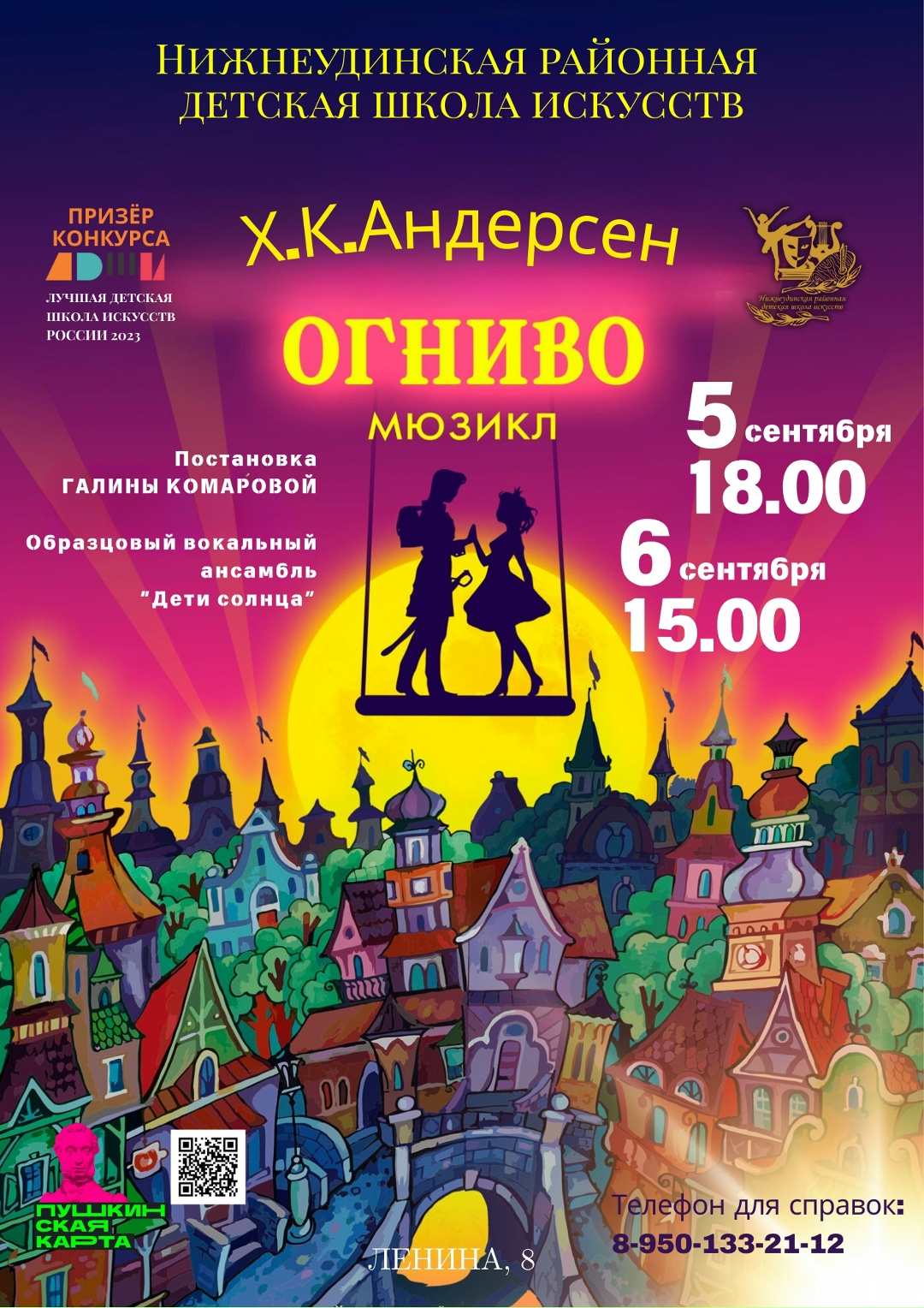 ОГНИВО ЯРКАЯ ПРЕМЬЕРА 2025 ГОДА! Приглашаем вас на долгожданную премьеру мюзикла «Огниво»! 5 сентября в 18:00 и 6 сентября в 15:00 в Нижнеудинской районной детской школе искусств вы окажетесь в волшебном мире сказок, где прекрасная музыка и живые эмоции создадут незабываемую атмосферу. На сцене развернется удивительная история, полная приключений и волшебства, которую вам подарят главные герои мюзикла. Каждый номер наполнен яркими моментами, которые останутся в вашем сердце надолго! Не упустите шанс стать частью этого блестящего зрелища! Мероприятие пройдет в рамках реализации проекта Приводите своих друзей и близких! Мы с нетерпением ждем вас на нашем музыкальном спектакле! | |
